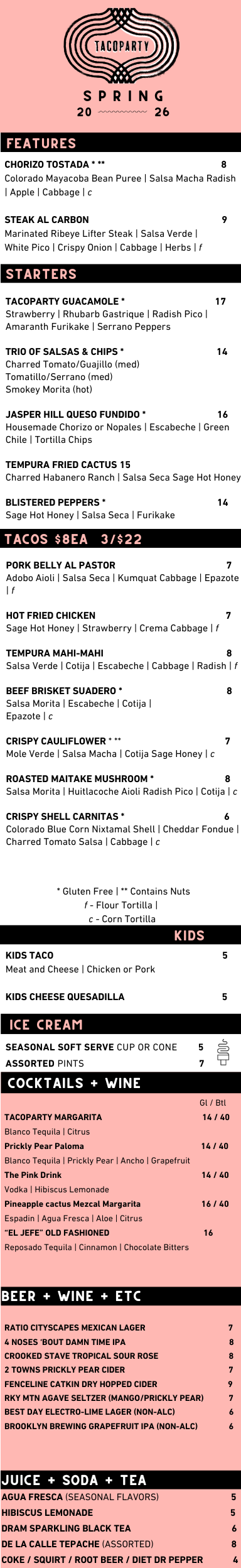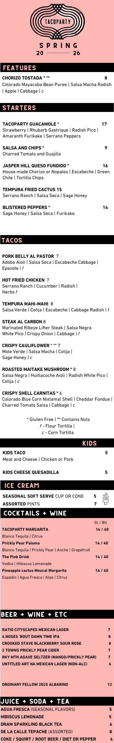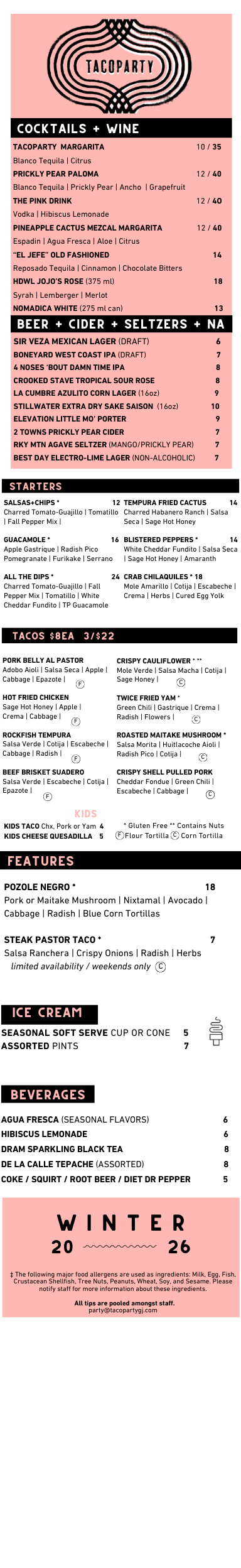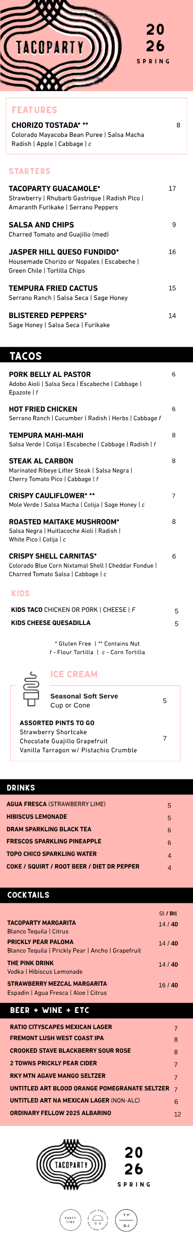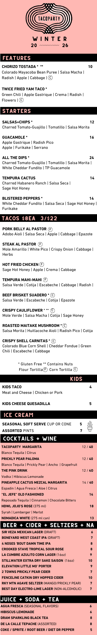 Tacoparty side steps tradition to celebrate our state’s heritage, along with the small producers that make our region and each of our amazing resources so distinct. Homegrown and homemade. Every dish is designed to give you, and your taste buds, an approachable take on contemporary Colorado cuisine in a ridiculously unexpected way.